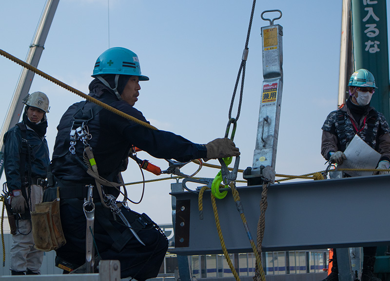 重機で鉄骨を持ち上げ、高所で組み上げていく作業はとても危険が伴うので一瞬たりとも気が抜けません。